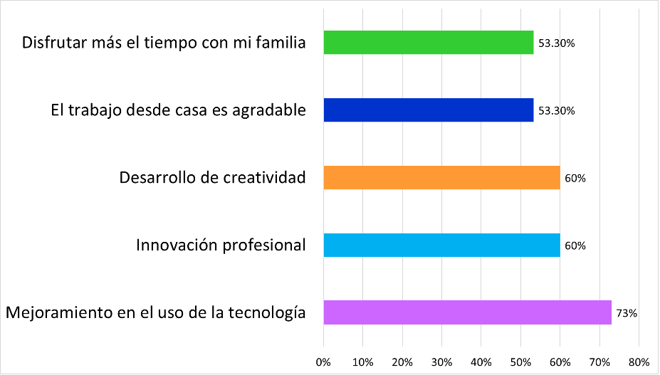 En contraste, las opciones menos populares fueron el ahorro en gastos extra y el tener más tiempo libre. Además, algunos integrantes de Omnilingua comentaron que, durante la nueva realidad, su productividad es más alta, y pueden organizarse mejor en sus labores y tareas diarias. En cambio, otros reconocen que, al trabajar desde casa, el cansancio mental es mayor.